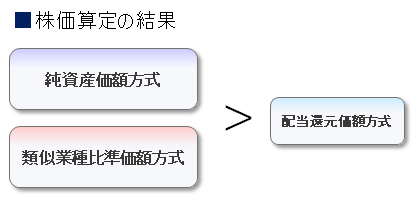 - 3つの方法で、株価算定をした価額は、通常、純資産価額・類似業種比準価額 > 配当還元価額という関係になる。