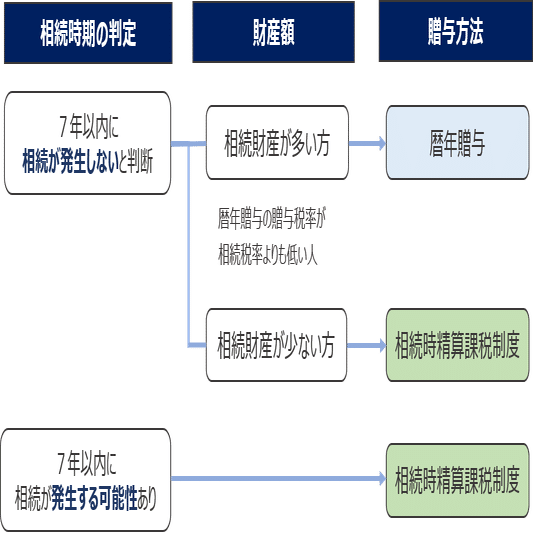 贈与方法の選択のポイントは、7年以内に相続が発生するのかということと贈与される方の財産額です。