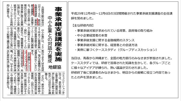 全国地方銀行協会様主催の「事業承継支援講座」研修で主任講師を努めました。